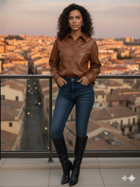 Camisa de vinipiel de botones larga color café