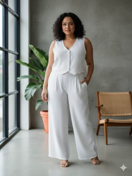 Conjunto de chaleco y pantalon de manta con lineas color blanco